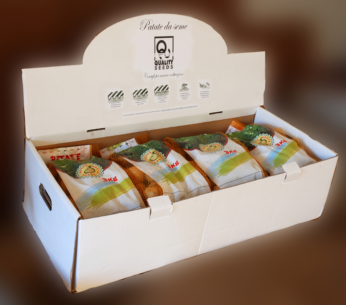 A partire dalla campagna 2012-2013 Quality Seeds propone un espositore da banco contenente 8 confezioni di patate da seme da 3 Kg.
